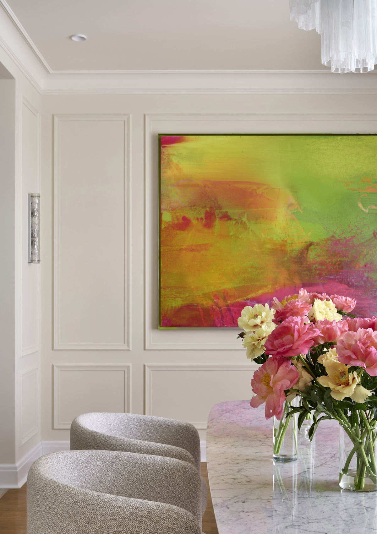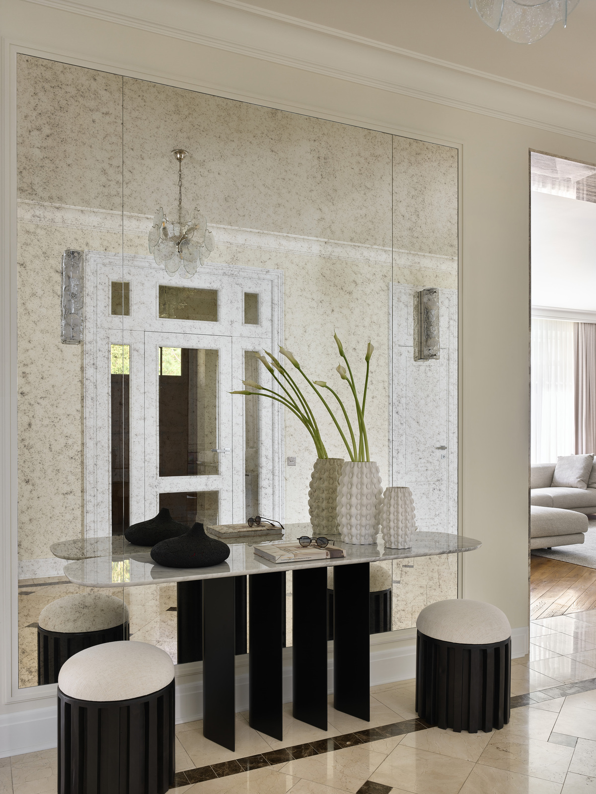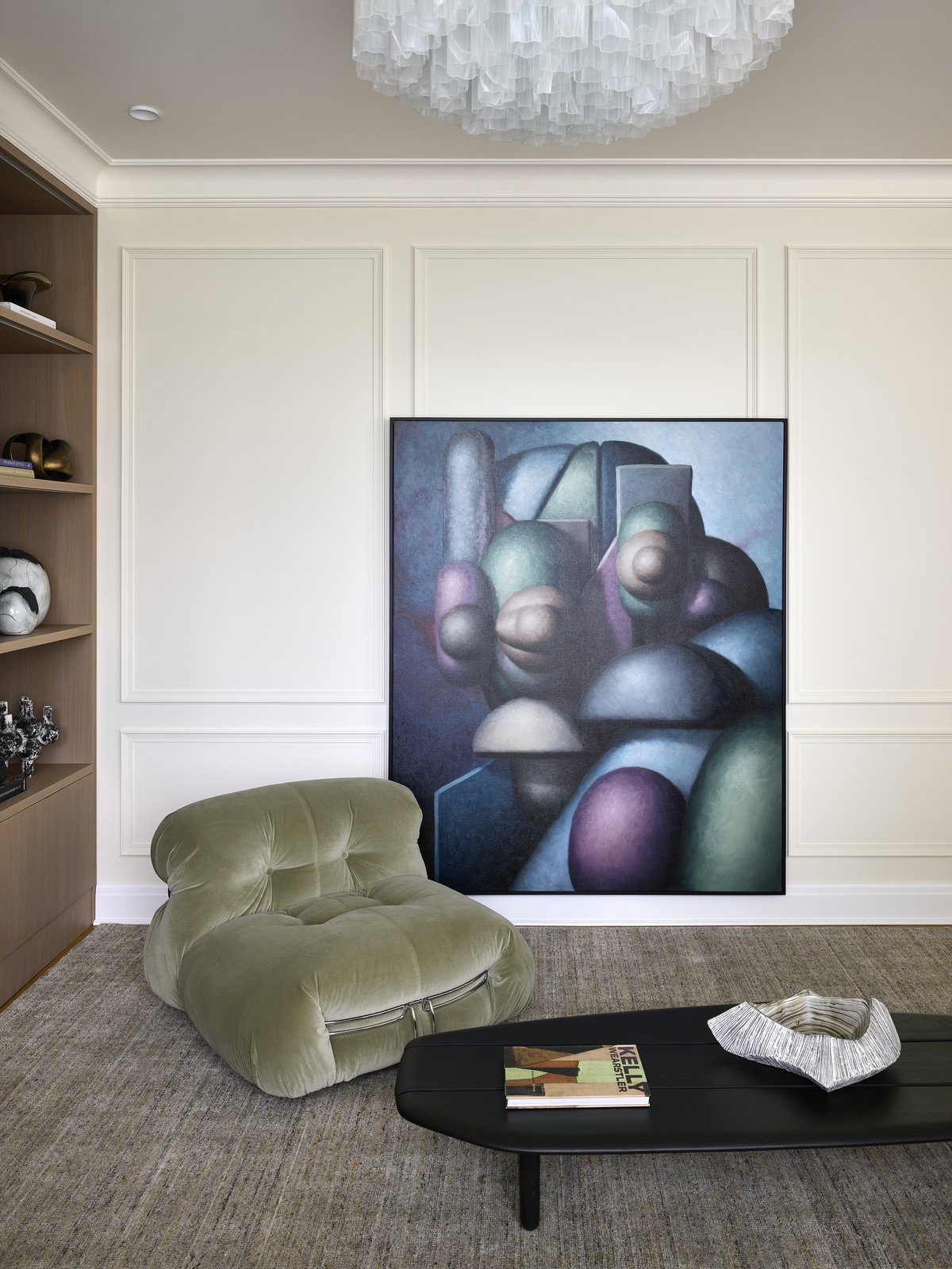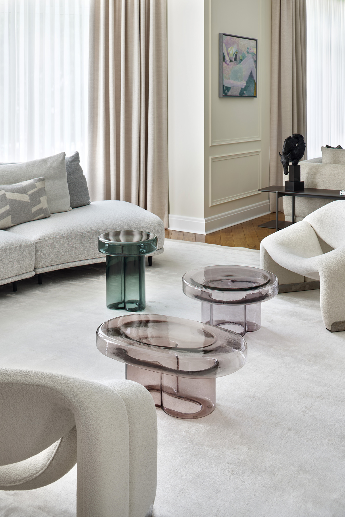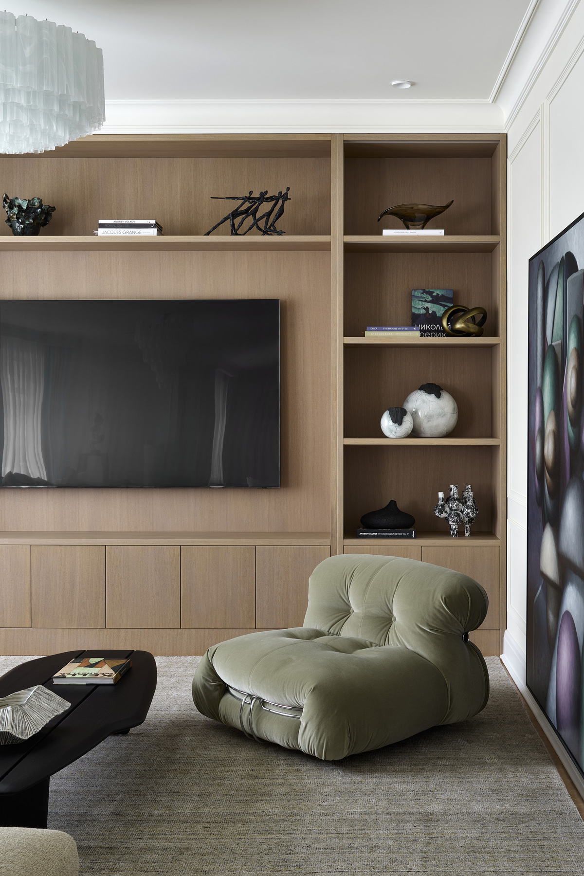 «Одна из самых удачных находок — винтажные кресла у камина. Они выполнены по дизайну Пьера Полена в 1970-х. И, конечно, кресло Cassina в зоне ТВ. Завершить образ помогли изящные светильники Venini в прихожей и главной спальне и редкий винтажный потолочный светильник по дизайну французского мастера Жана Новерди».