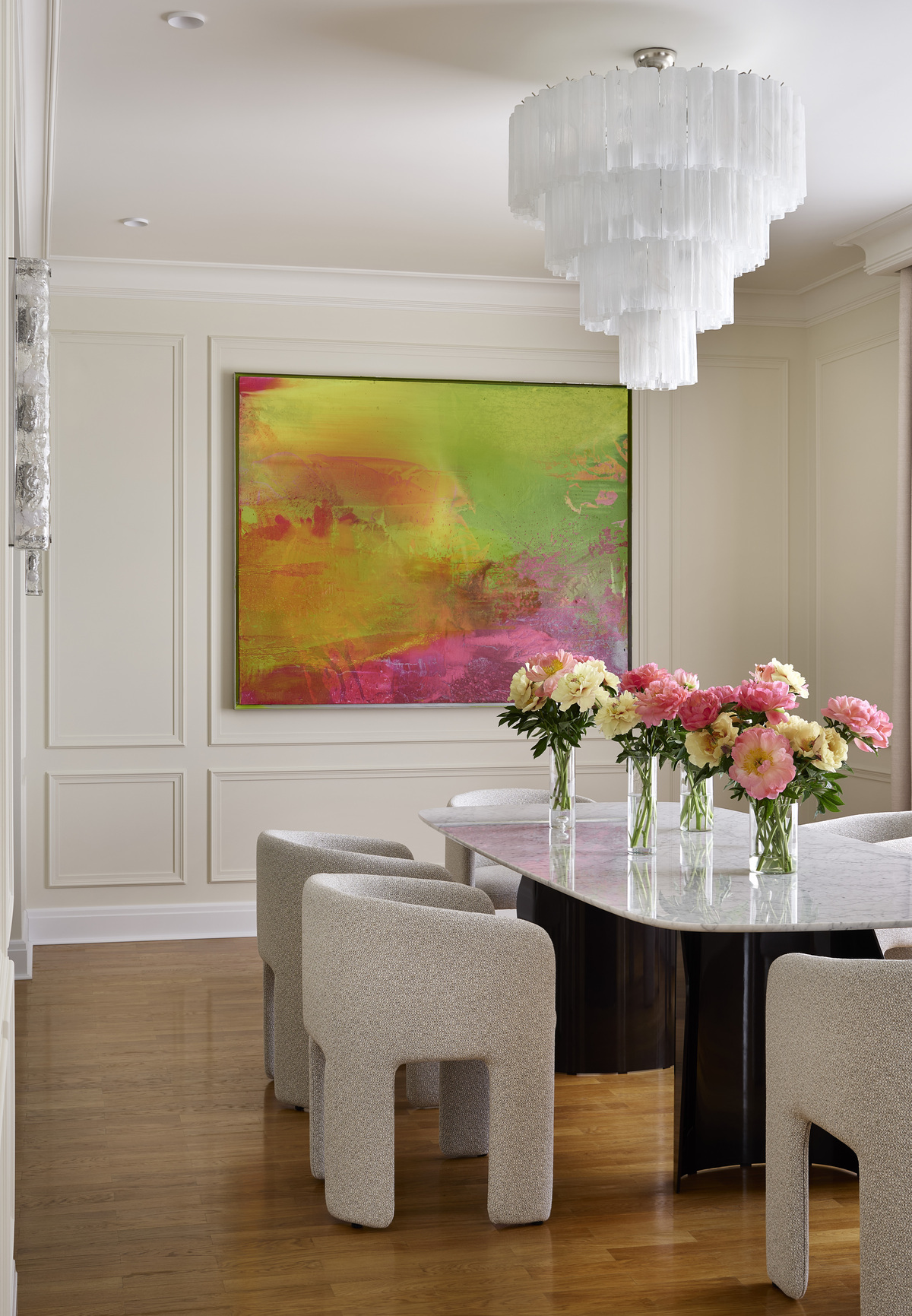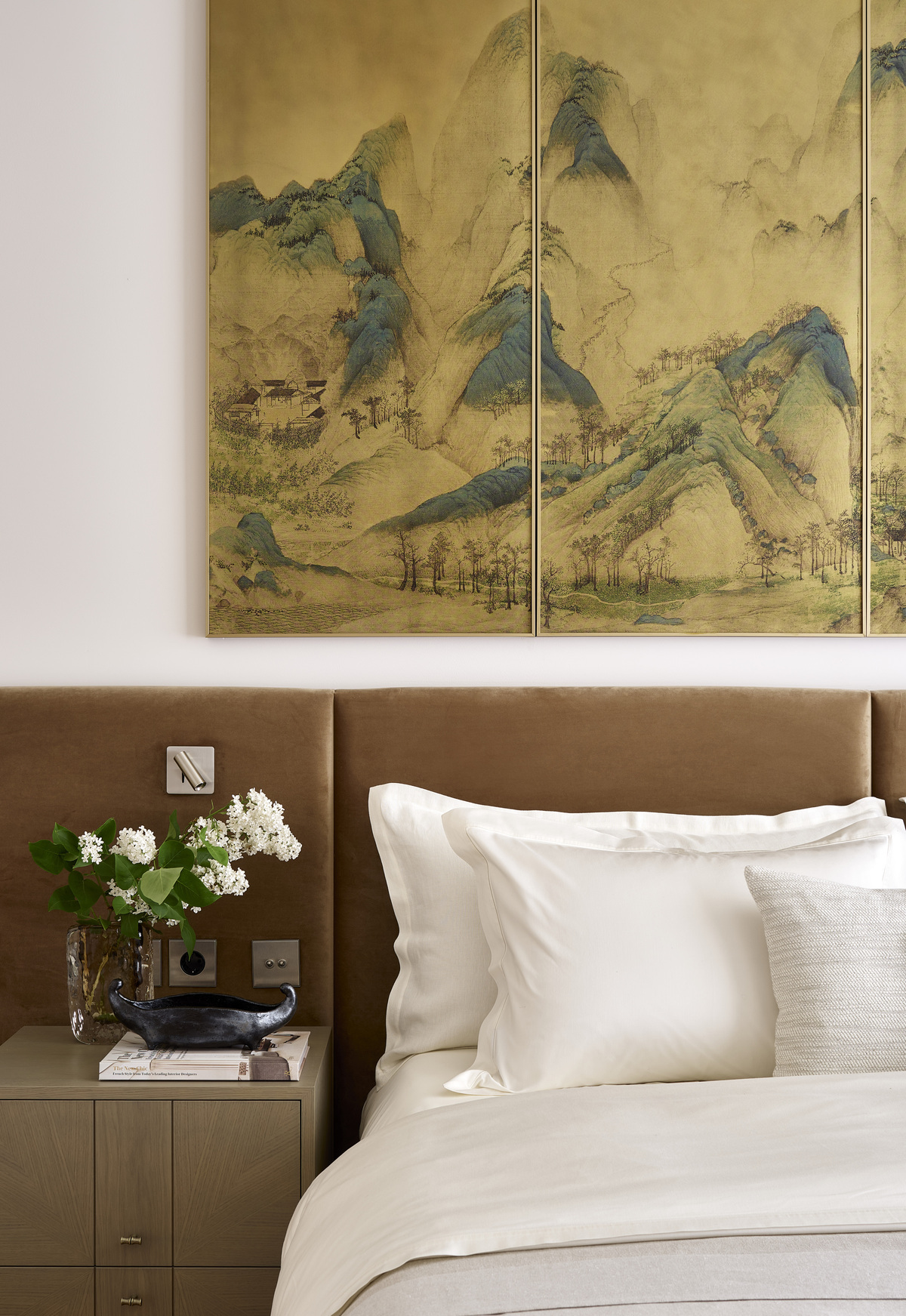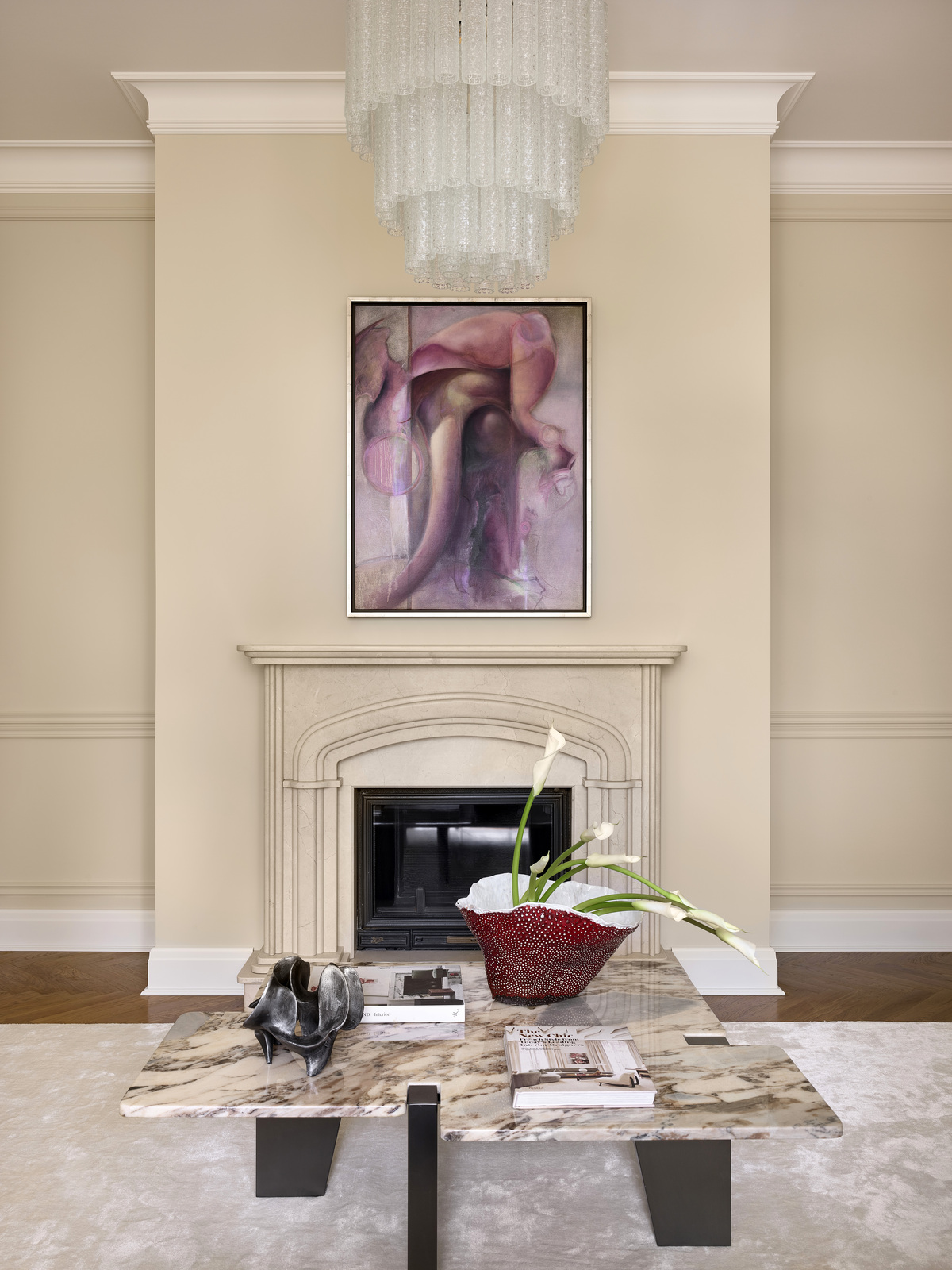 «Главным пожеланием заказчиков было привнести в дом новую жизнь с учетом их интересов — они увлекаются искусством, коллекционируют винтаж и керамику, — рассказывает Оксана. — Мы создали интерьер, где гармонично сосуществуют коллекционный дизайн и новые предметы, причем собрание можно постоянно пополнять, в доме достаточно мест для его экспонирования. Моей задачей было максимально бережно отнестись к исходным данным и с помощью минимальных вмешательств создать новый облик дома. Благодаря многослойности кажется, что на формирование интерьера ушли годы».В доме два этажа, а его общая площадь составляет 540 кв. метров.Что касается планировки, обновление затронуло только кухню — ее площадь немного увеличили. Выход в гараж и зону спа с бассейном сделали максимально незаметным, выполнив его в цвете стен. Благодаря открытому проему между кухней и столовой зоной в основном пространстве первого этажа всегда много света. «Мы также визуально увеличили высоту дверей, добавив сверху декоративную фрамугу. Таким образом высота с 2,2 метра выросла до 2,6 метра», — говорит дизайнер.Второй этаж включил личные пространства — главную спальню и детскую комнату.Все стены окрашены краской Shwerwin-Williams, которая создает красивые вариации оттенков при смене освещения. Для облицовки проемов в гостиной и портала нового камина — старый полностью демонтировали — использован травертин, а на кухне — редкий сорт мрамора Lilac. «Экстерьер и интерьер остаются всегда взаимосвязанными, и цветовая палитра сложилась с учетом этого фактора. Мы использовали сложные оттенки коричневого, шоколадного, умбры, изумрудного зеленого, — добавляет дизайнер. — А в основе лежат светлые тона, чтобы выгодно подчеркнуть коллекцию искусства.Заказчики много путешествуют, пополняя коллекцию предметами со всего мира, и всегда с радостью возвращаются домой».