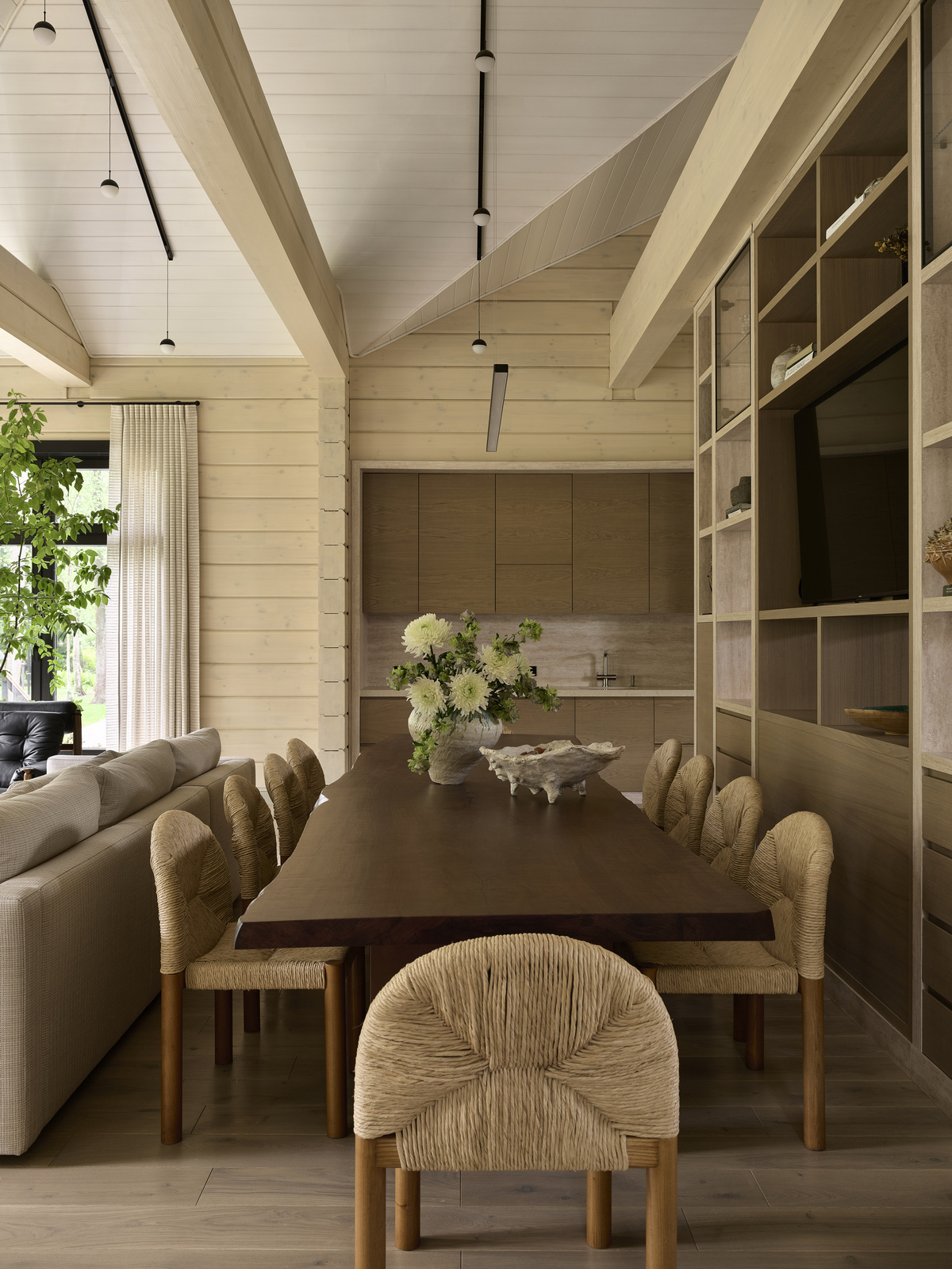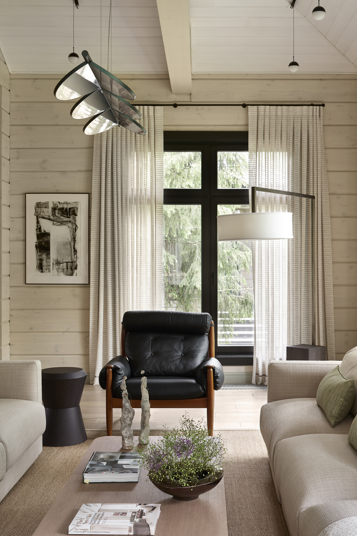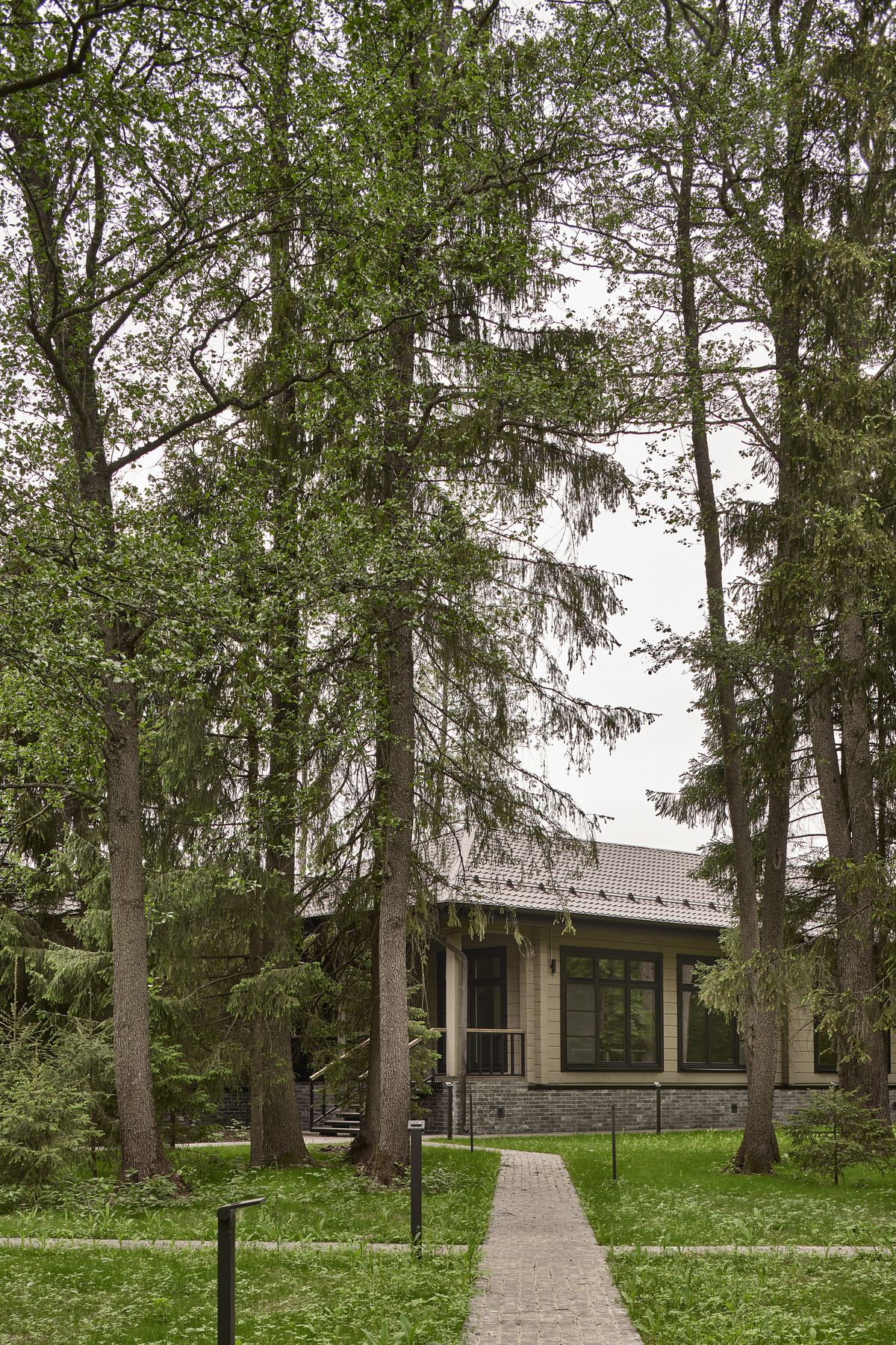 Наши постоянные заказчики попросили спроектировать и оформить гостевой дом для их дружной семьи. Сначала нашей задачей спроектировать сам дом, бережно интегрировав его в лес, который примыкает к участку, а затем оформить пространство с точки зрения функционала и предпочтений клиентов. Они увлекаются винтажными предметами, авторской керамикой и т.д. Дом площадью 360 кв.м. имеет большую гостиную и столовую зоны, с другой стороны- бильярд. Мы спроектировали витрину в гостиной таким образом, что телевизор можно поворачивать и смотреть с 2-х зон. Также имеется семейная гостиная и примыкающие к ней две спальни. В другом крыле дома мы разместили тренажерный зал, сауну и комнату отдыха. Заказчики очень полюбили этот дом и проводят в нем больше времени, чем в основном, который находится рядом.