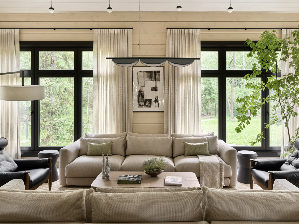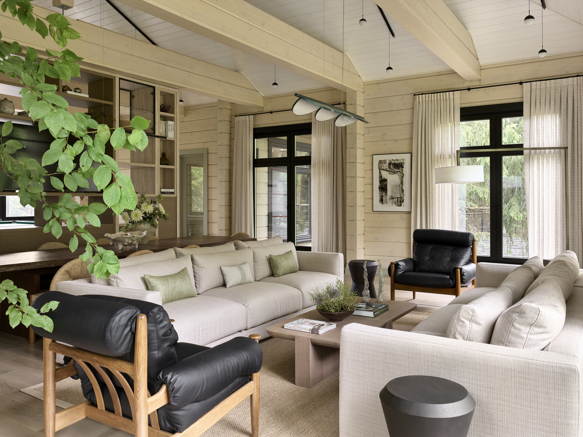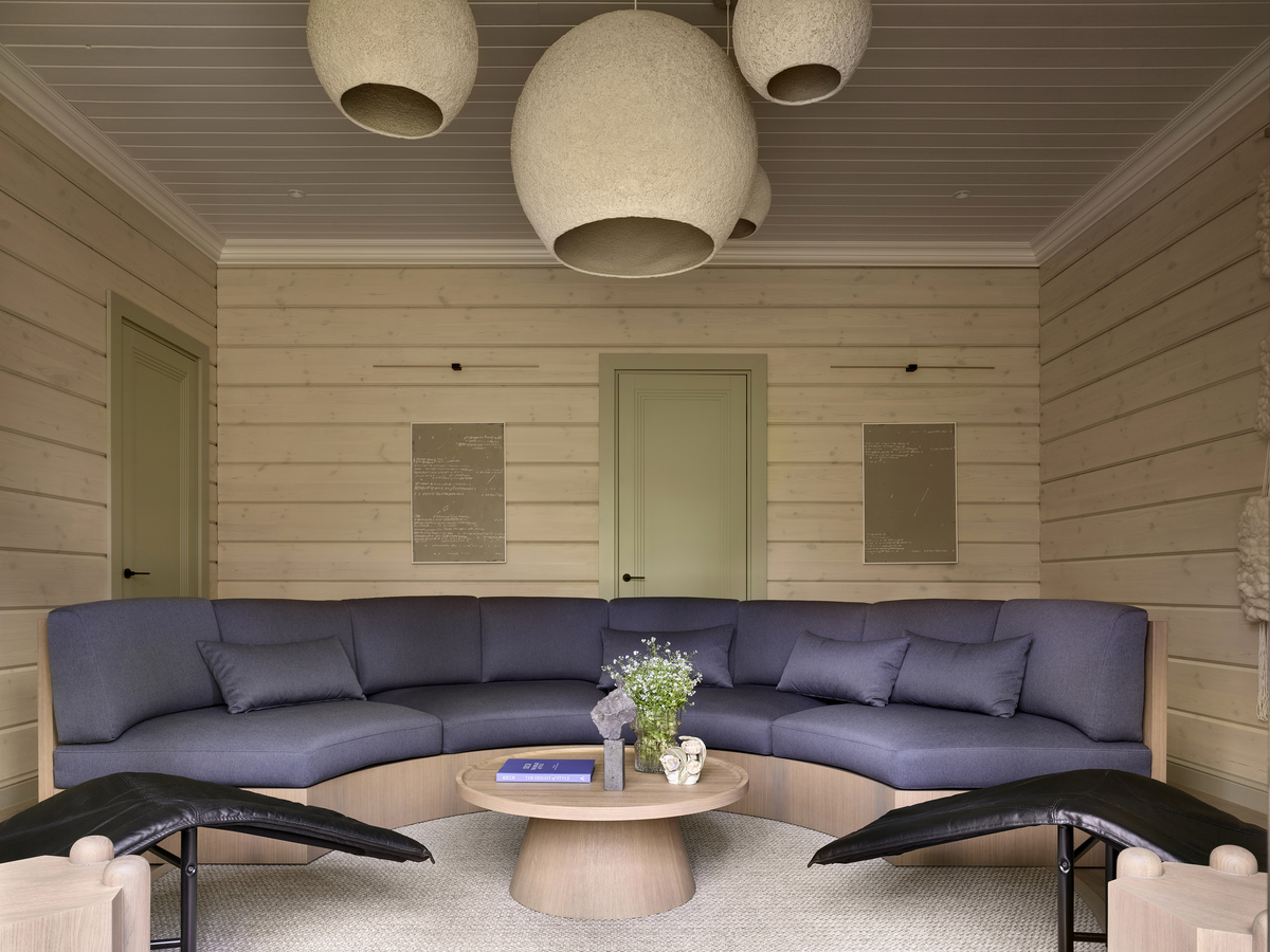 Наши постоянные заказчики попросили спроектировать и оформить гостевой дом для их дружной семьи. Сначала нашей задачей спроектировать сам дом, бережно интегрировав его в лес, который примыкает к участку, а затем оформить пространство с точки зрения функционала и предпочтений клиентов. Они увлекаются винтажными предметами, авторской керамикой и т.д. Дом площадью 360 кв.м. имеет большую гостиную и столовую зоны, с другой стороны- бильярд. Мы спроектировали витрину в гостиной таким образом, что телевизор можно поворачивать и смотреть с 2-х зон. Также имеется семейная гостиная и примыкающие к ней две спальни. В другом крыле дома мы разместили тренажерный зал, сауну и комнату отдыха. Заказчики очень полюбили этот дом и проводят в нем больше времени, чем в основном, который находится рядом.