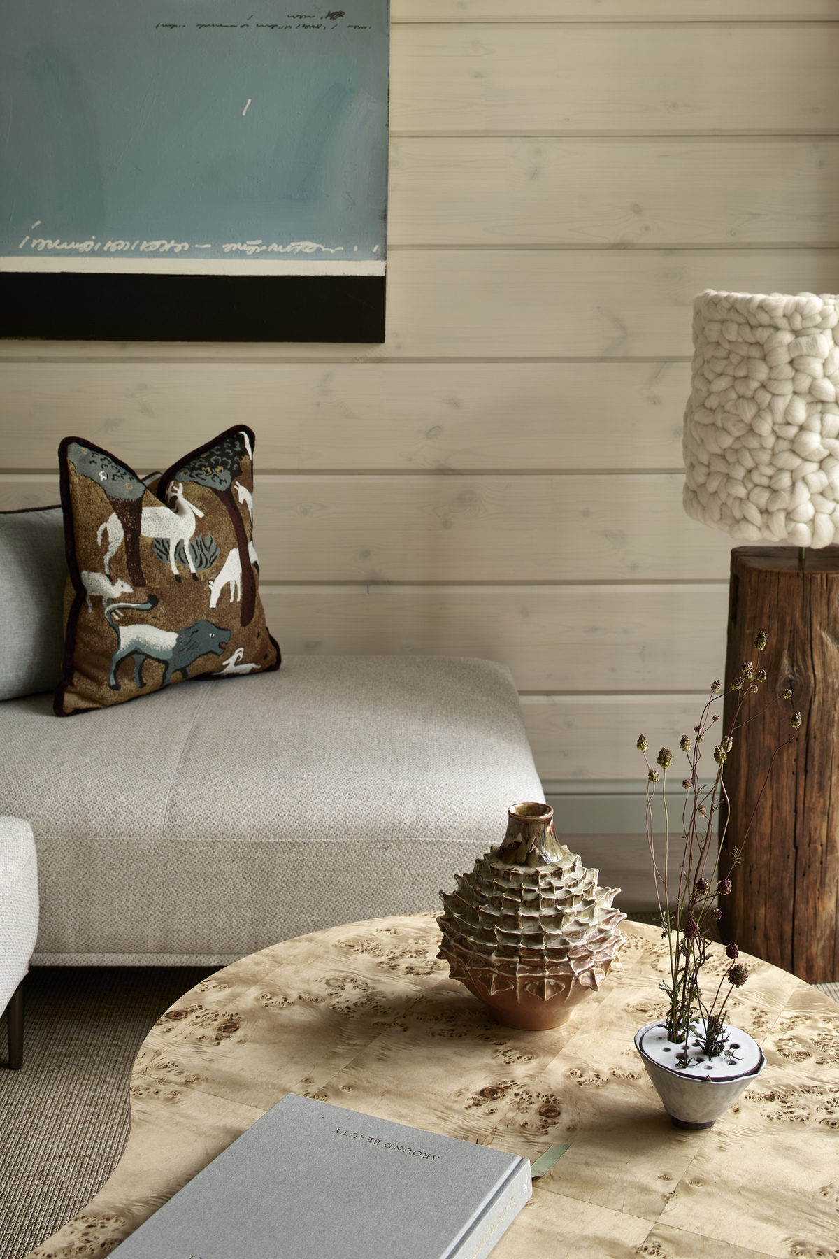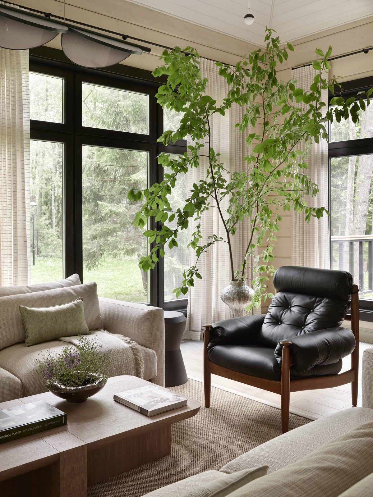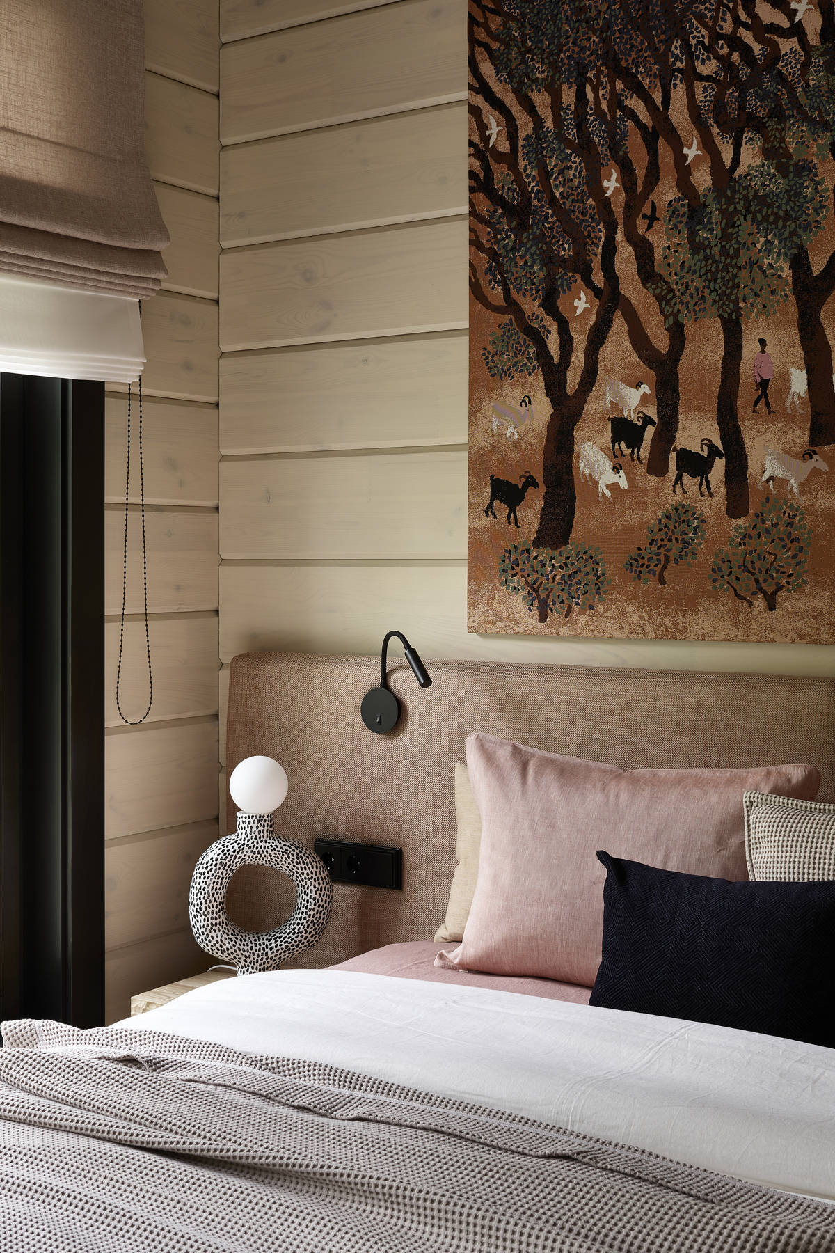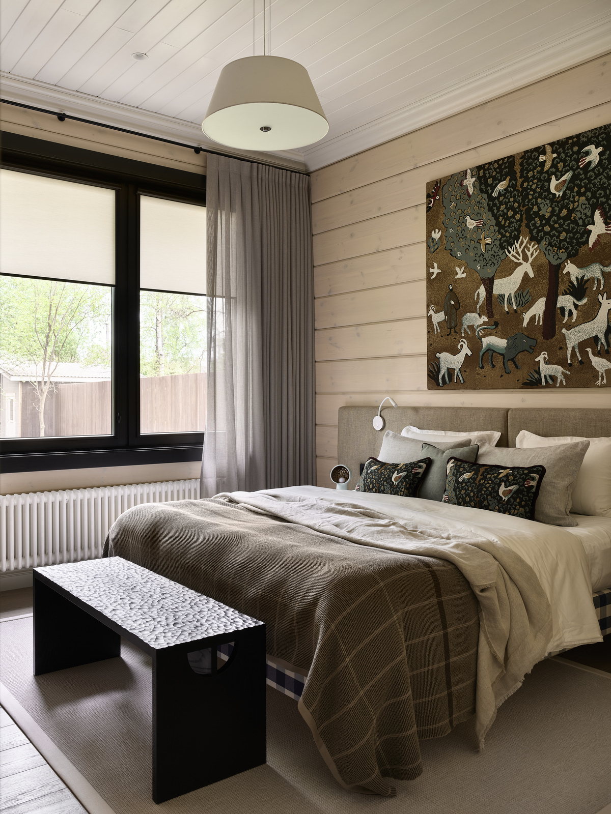 Интерьер и экстерьер взаимосвязаны. В этом проекте мы наглядно это продемонстрировали. Каждый предмет отсылает к природе. В интерьер много натурального дерева, камня, керамики, сизали и др. Гобелены в спальнях братьев Либа иллюстрируют сюжеты на природе и др.