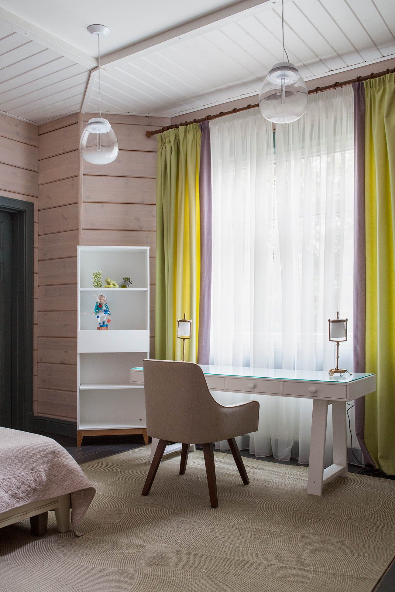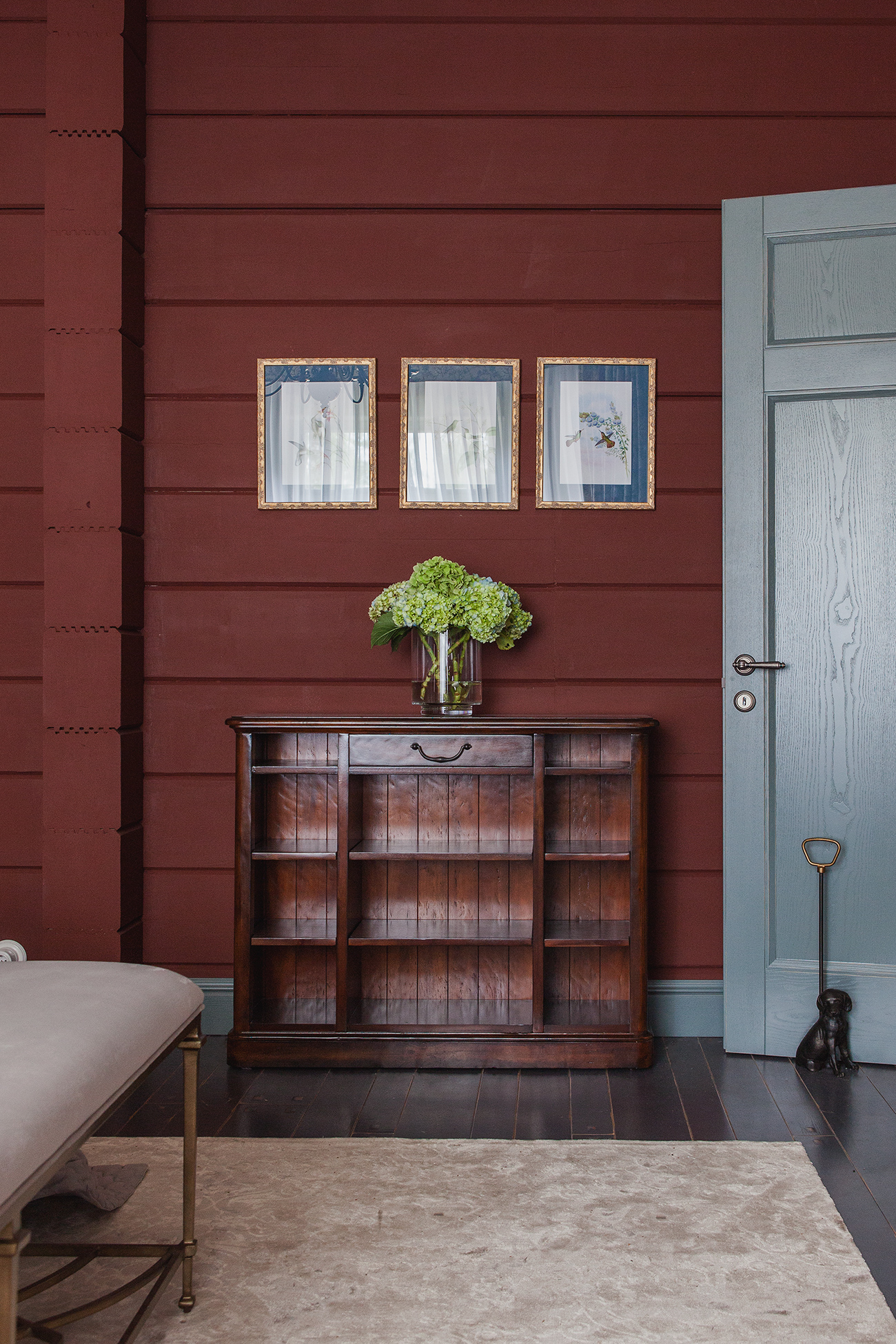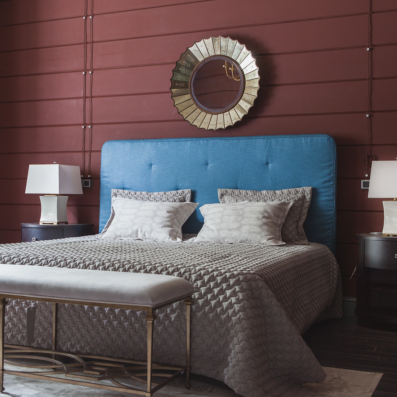 Стены насыщенных вишневых и синих оттенков. Обои с ярко выраженным дизайном. Элегантный тонированный брус светлых тонов. Нашей задачей было декорировать и оживить загородный дом, подчеркнуть уникальный стиль и привнести нотки уюта, красиво «обыграв» имеющееся оформление.