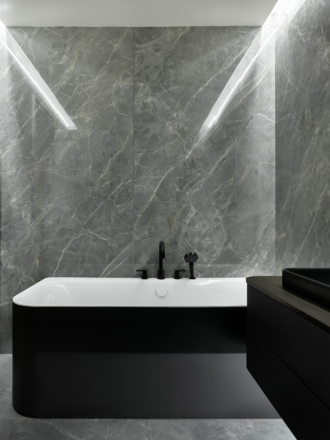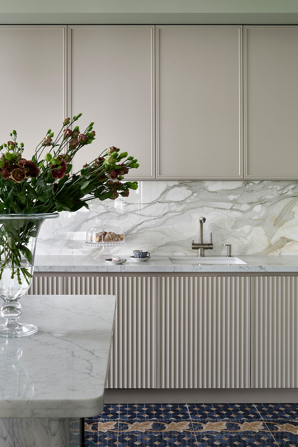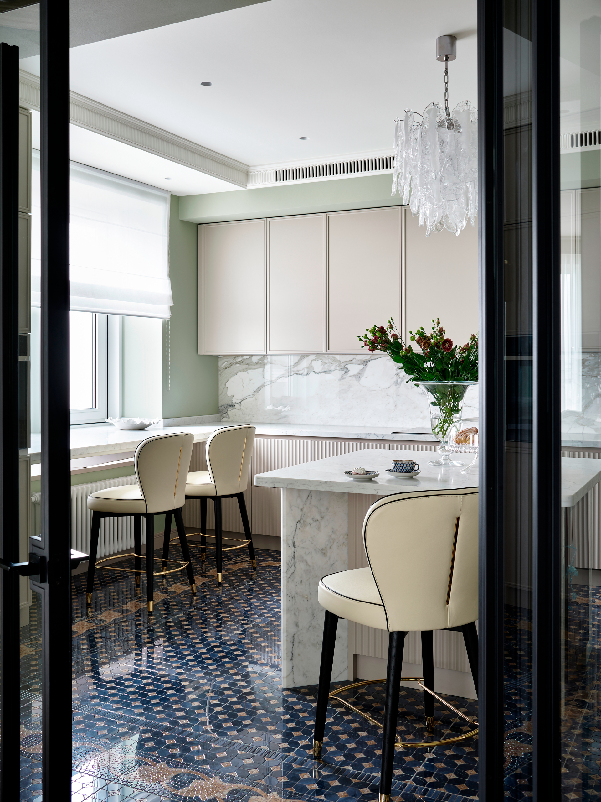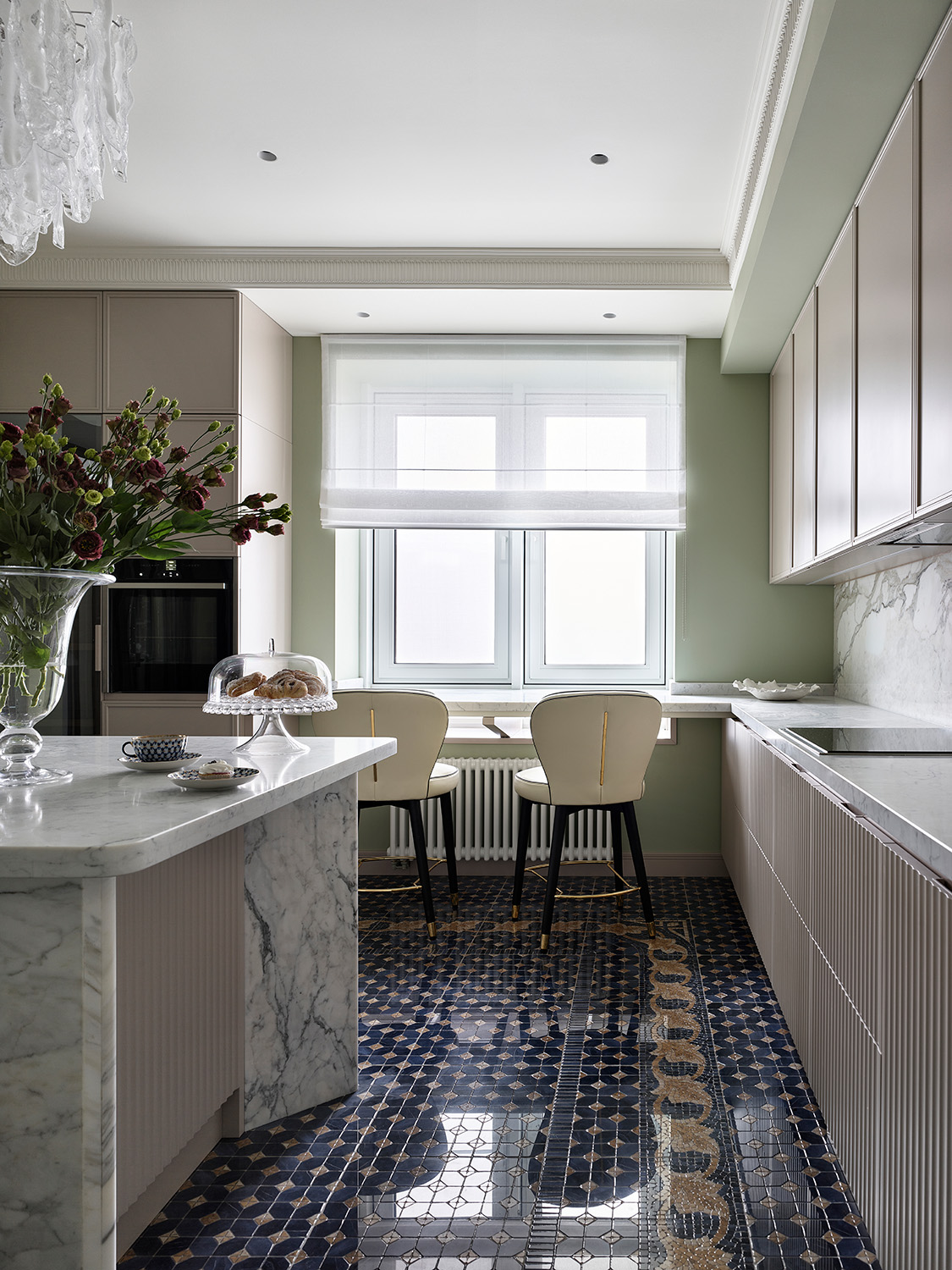 Главным украшением кухни стал остров. С одной стороны в него встроен винных шкаф, а с другой — система хранения. При своем довольно внушительном размере остров не кажется громоздким. Это все благодаря изогнутой конструкции — элементы изножья и столешница выполнены из мрамора, а центральный фасад рифмуется с самой кухней.