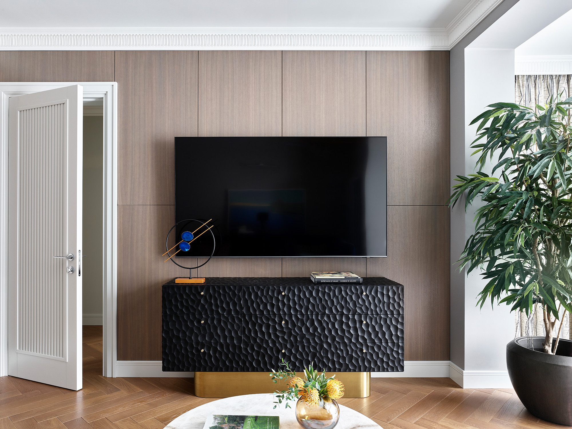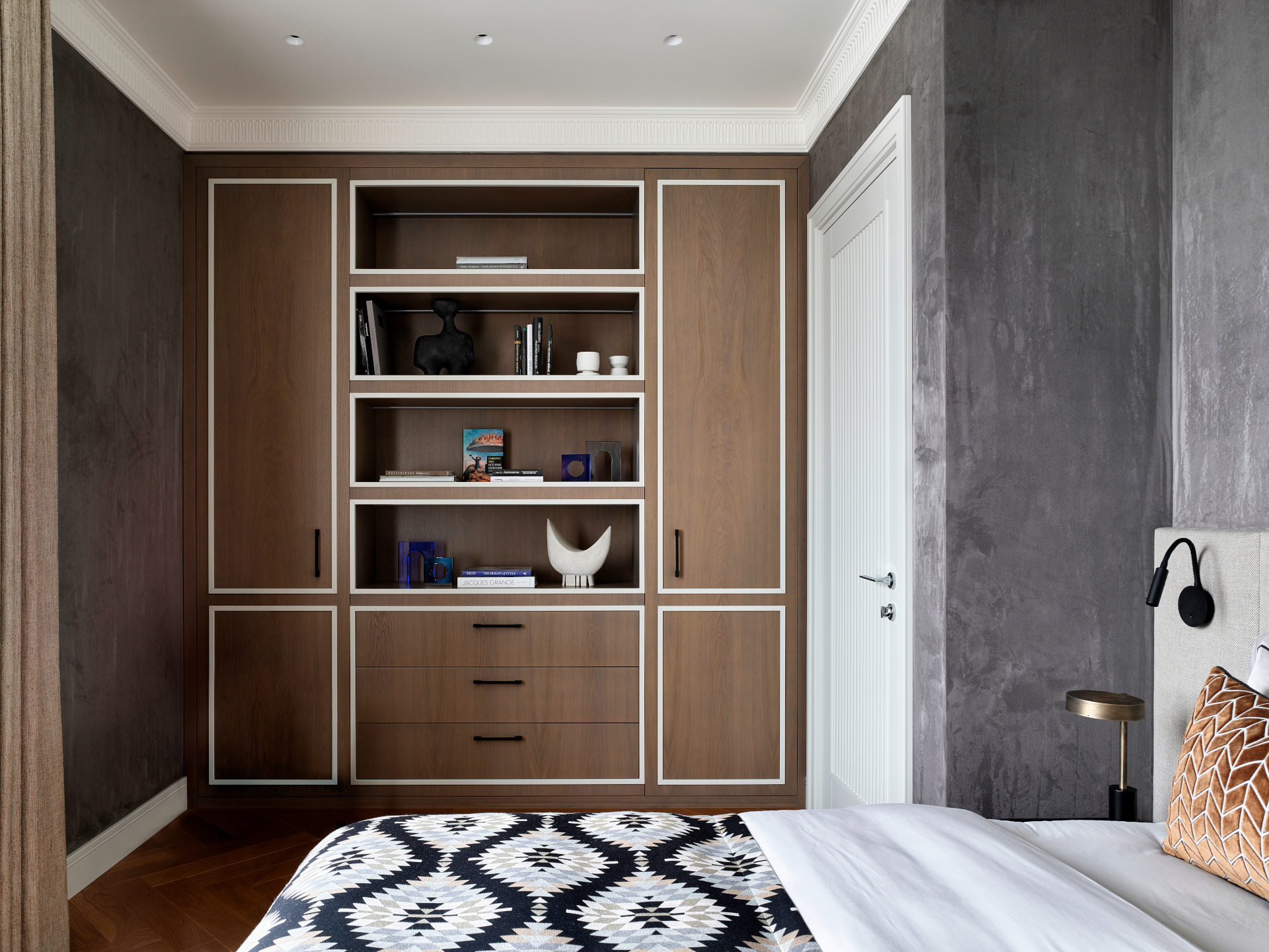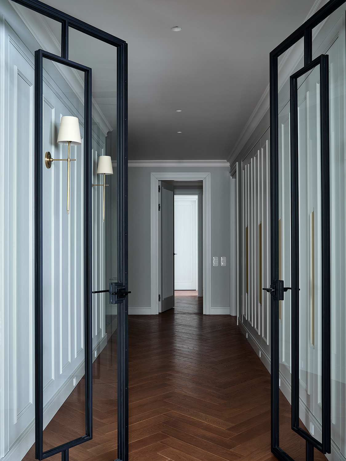 В этой квартире заказчица живет вместе с сыном-студентом. Изначально она хотела создать классический интерьер со сложной деталировкой гипсовых карнизов, паркетом с рисунком и другими характерными деталями этого стиля. Однако заказчик и его сын — приверженцы современной эстетики. В итоге нам пришлось искать баланс между этими двумя кардинально разными запросами.