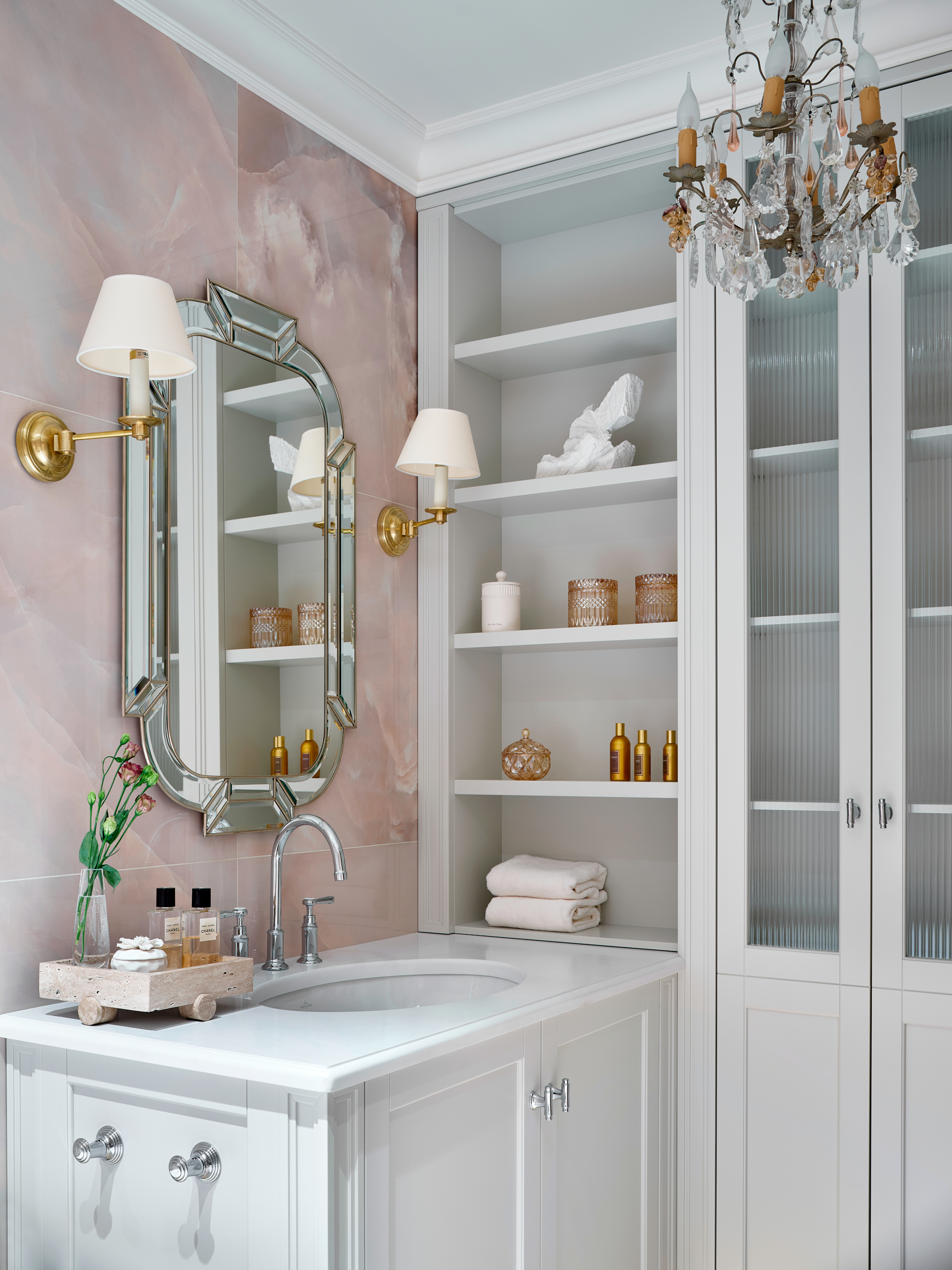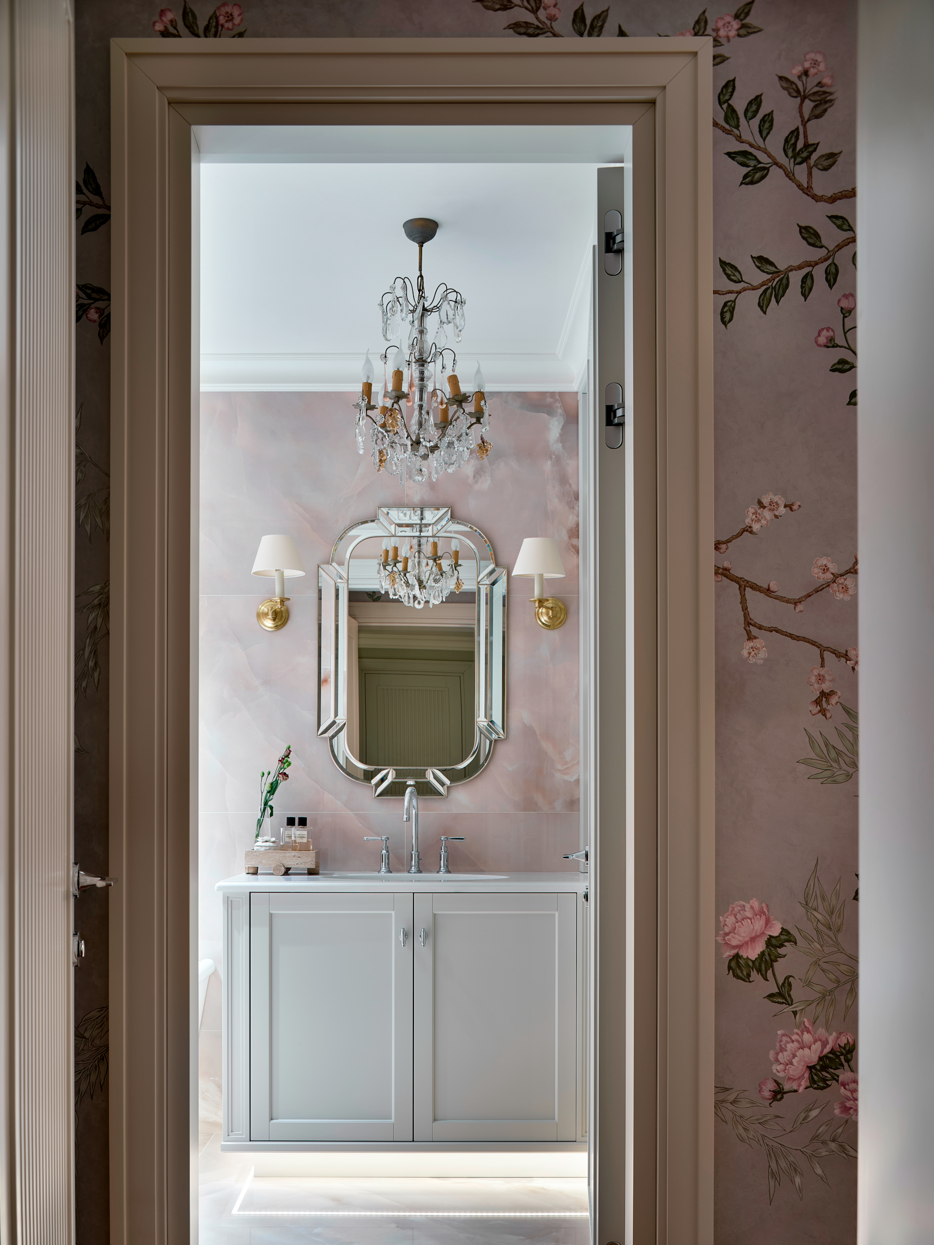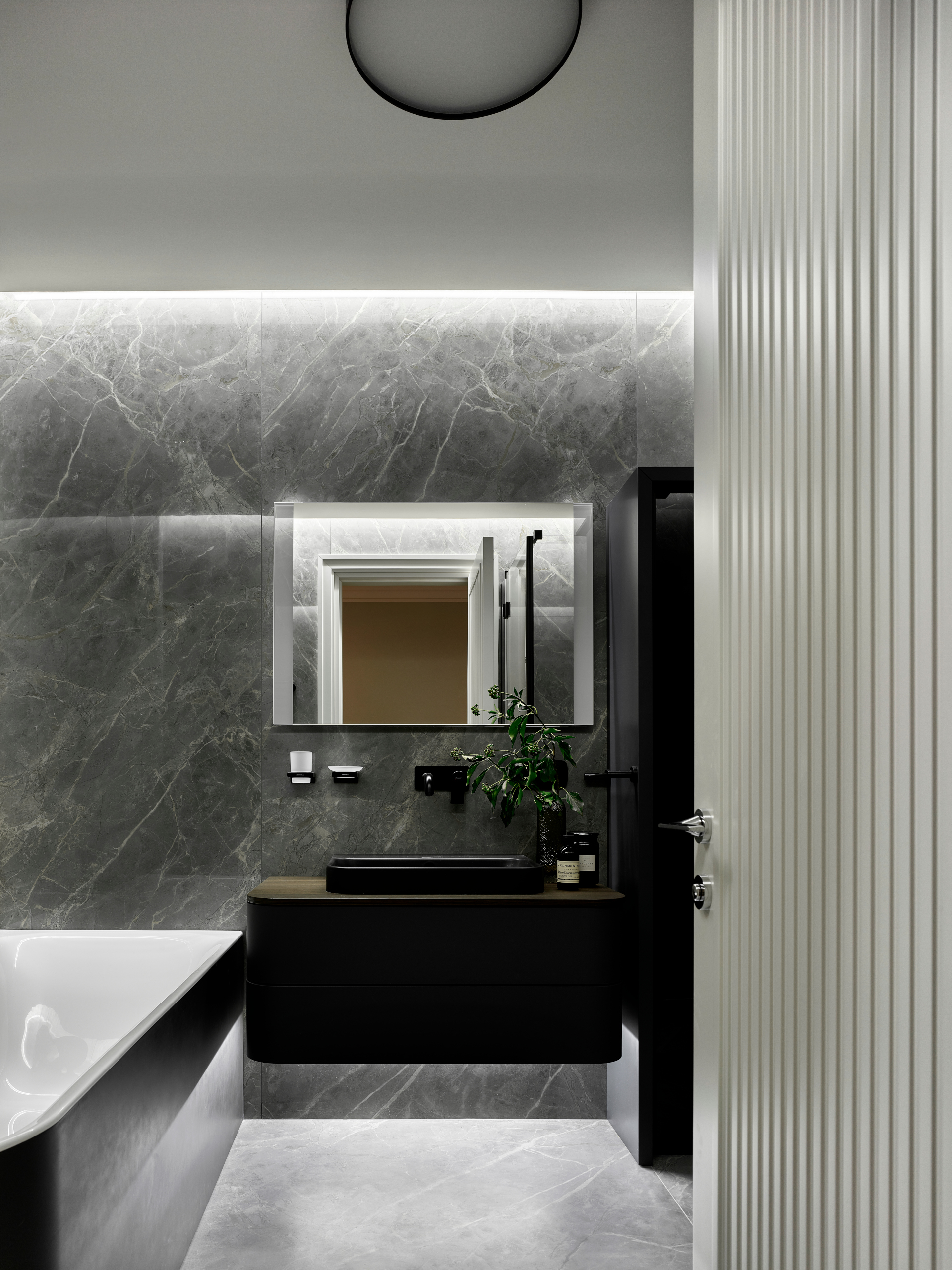 В прихожей гостей встречает «ковер» из голубого мрамора. Справа от входа располагается зеркальная дверь в полный рост. За ней размещен блок отдельной гардеробной с хозяйственным шкафом, гостевой санузел и постирочная.