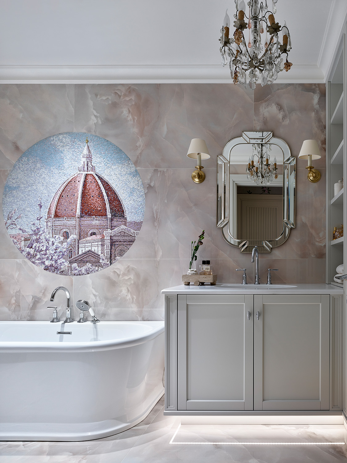 Архитектурная особенность гостиной — полукруглая стена с панорамными окнами, из которых открывается вида на Ленинский проспект и купол соседнего корпуса. Купол напоминал заказчице собор Санта-Мария-дель-Фьоре во Флоренции, который она очень любит. Эту тему мы продолжили в главном санузле, сделав на ванной мозаику с изображением собора.Изогнутую линию остекления повторяют полукруглые диваны. Их дизайн вдохновлен работами Владимира Кагана. Между диванами располагается биокамин — маленькая мечта заказчицы. Портал сделан из белоснежного мрамора, боковые элементы перекликаются с рисунком гипса на колонне и рифлеными фасадами кухни.