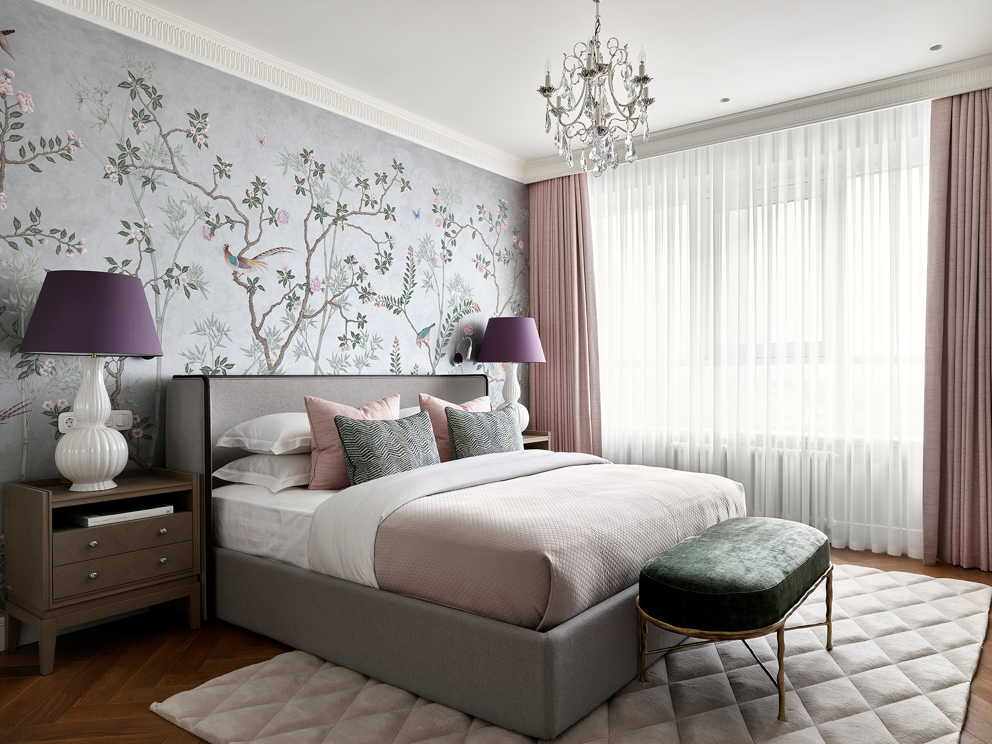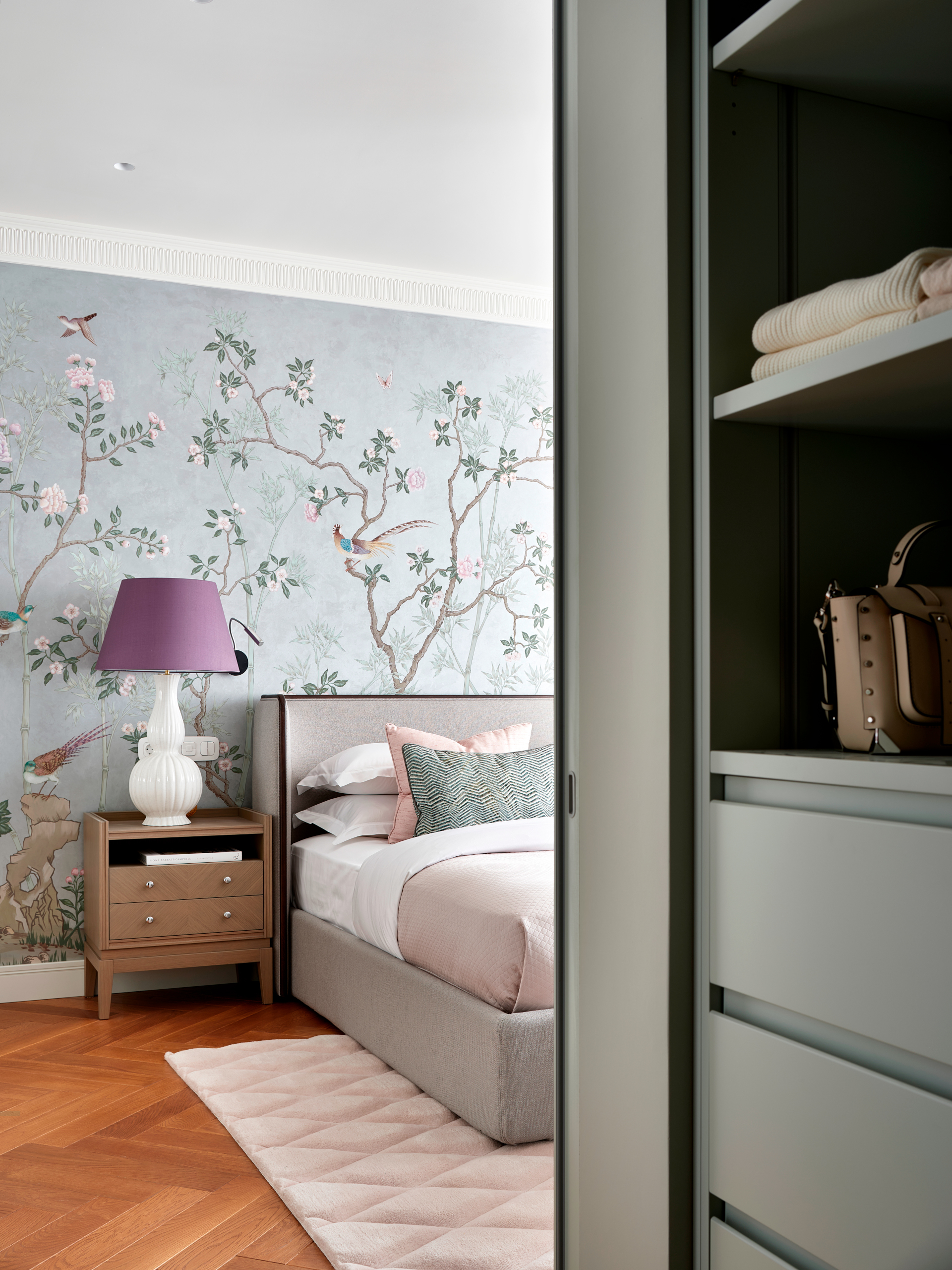 В спальне хозяйки все внимание привлекает настенная роспись с изображением цветущих деревьев и птиц.